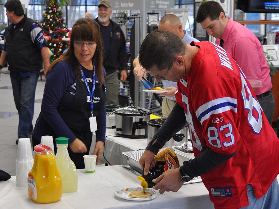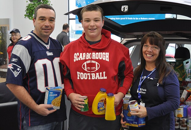 Preble Street Pancake Breakfast and Food Drive. Here, Melanie McKean from Preble Street is helping to serve some of the hungry sales associates and customers. She joined Patriot Subaru Service Manager Glen Reed, and his son Zack to help load the Forester with donations brought in by employees and customers. We stuffed it several times!