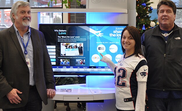 Preble Street Executive Director Mark Swann joins Patriot Subaru's Ashley Poirier and Jim Connolly at the Subaru Digital Showroom, where customers can choose from one of five charities for the Share The Love Event. Preble Street is Patriot Subaru's local charity.