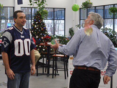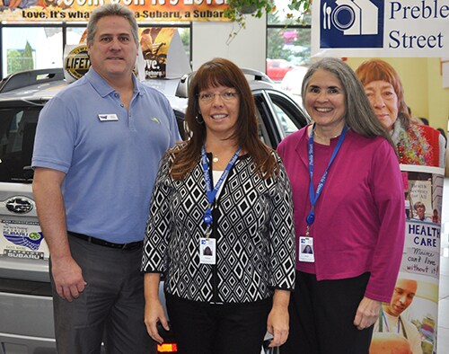 Patriot Subaru General Manager Brian Beattie welcomes Preble Street associates Melanie McKean, Development Coordinator, and Elena Schmidt, Chief Development Officer.